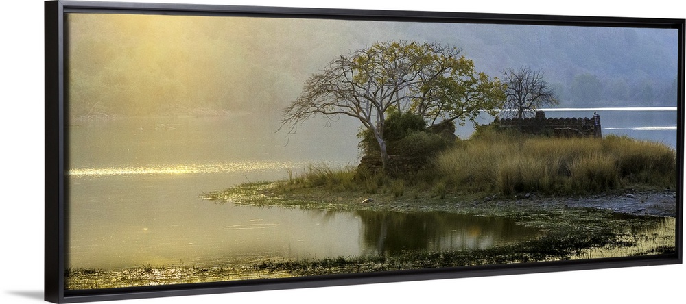<p>Trees and grasses growing on a sandbar in the water in Ranthambore National Park, Rajasthan, India.</p>