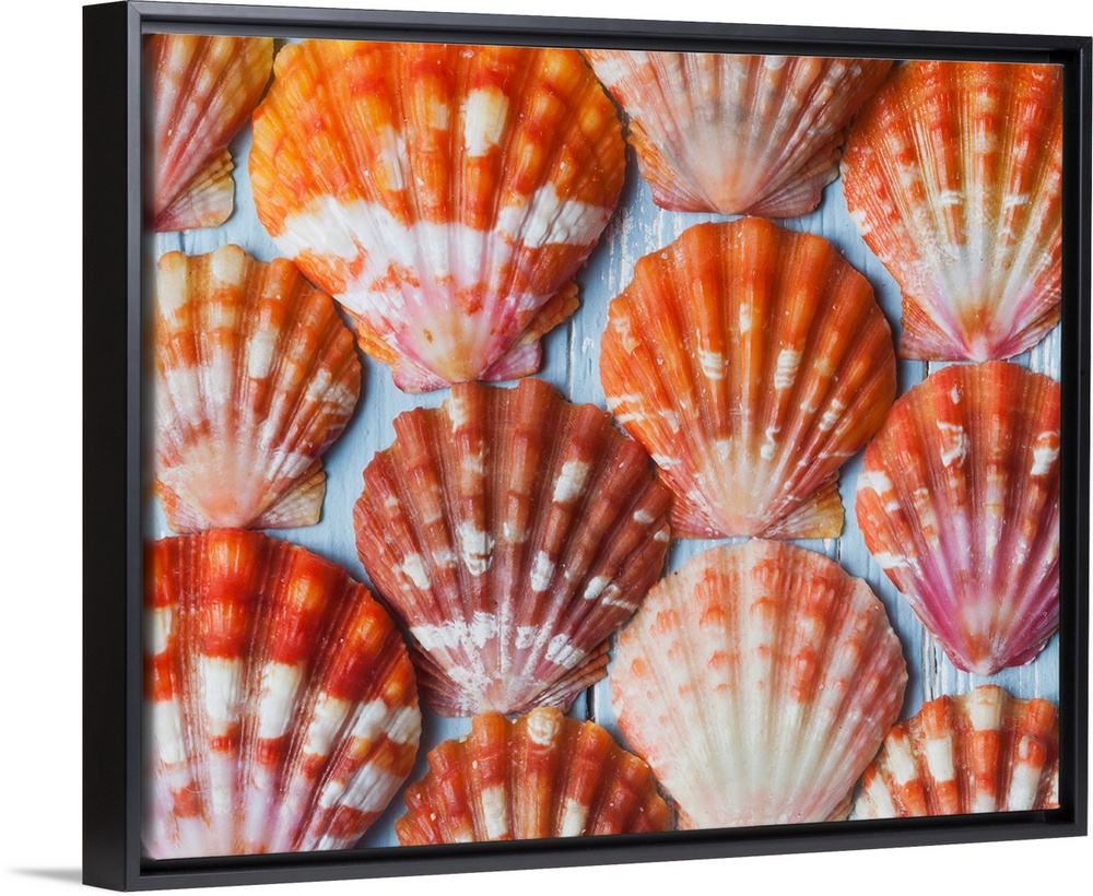 <p>Rare, indigenous Hawaiian red sunrise scallop shells (Langford Pecten) laid out on a blue background; Honolulu, Oahu, Hawaii, United States of America</p>