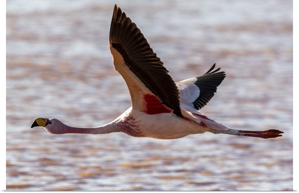 <p>Rare James's flamingo (Phoenicoparrus jamesi), in flight, Eduardo Avaroa Andean Fauna National Reserve, Bolivia, South America</p>