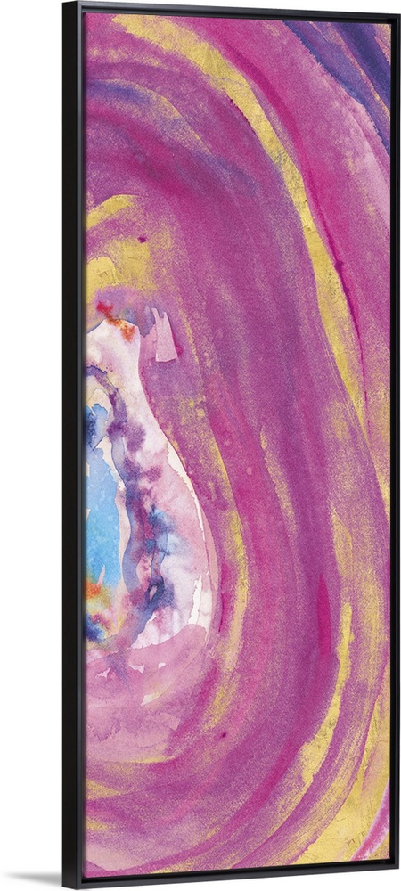 <p>Tall, rectangular abstract painting of the inside of a mineral with pink, purple, blue, and gold hues.</p>