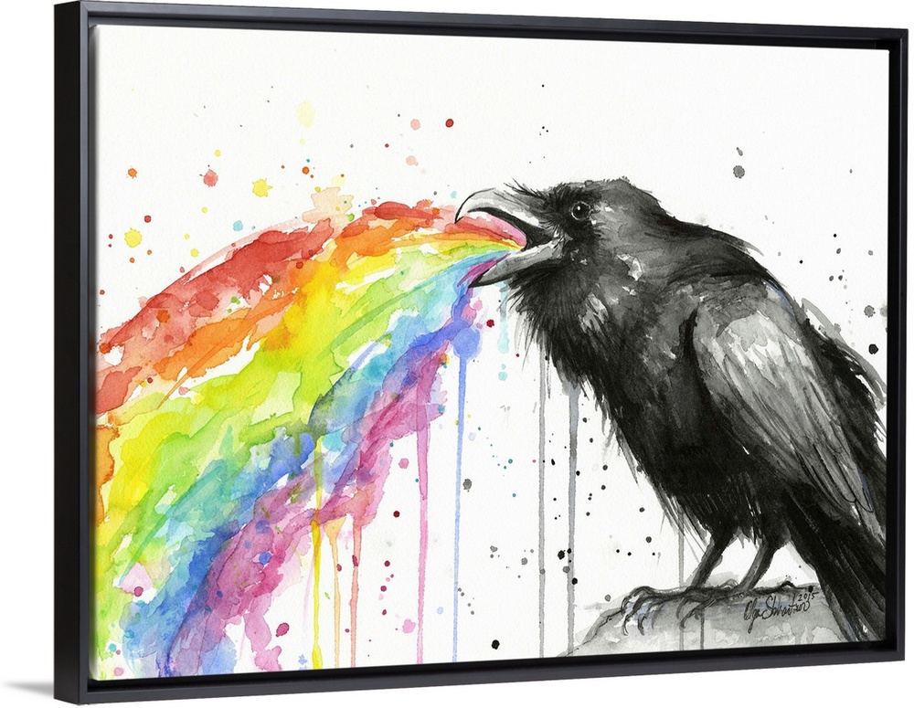 <p>A contemporary watercolor painting of a raven throwing up a rainbow.</p>