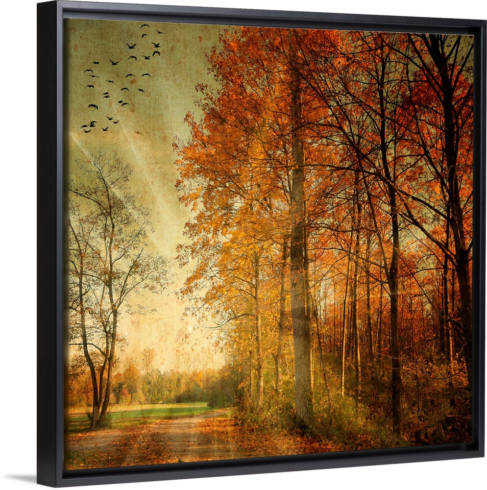 <p>Square fine art photograph on a large wall hanging of the setting suns rays shining through an autumn colored forest, while a small flock of birds fly overhead.</p>