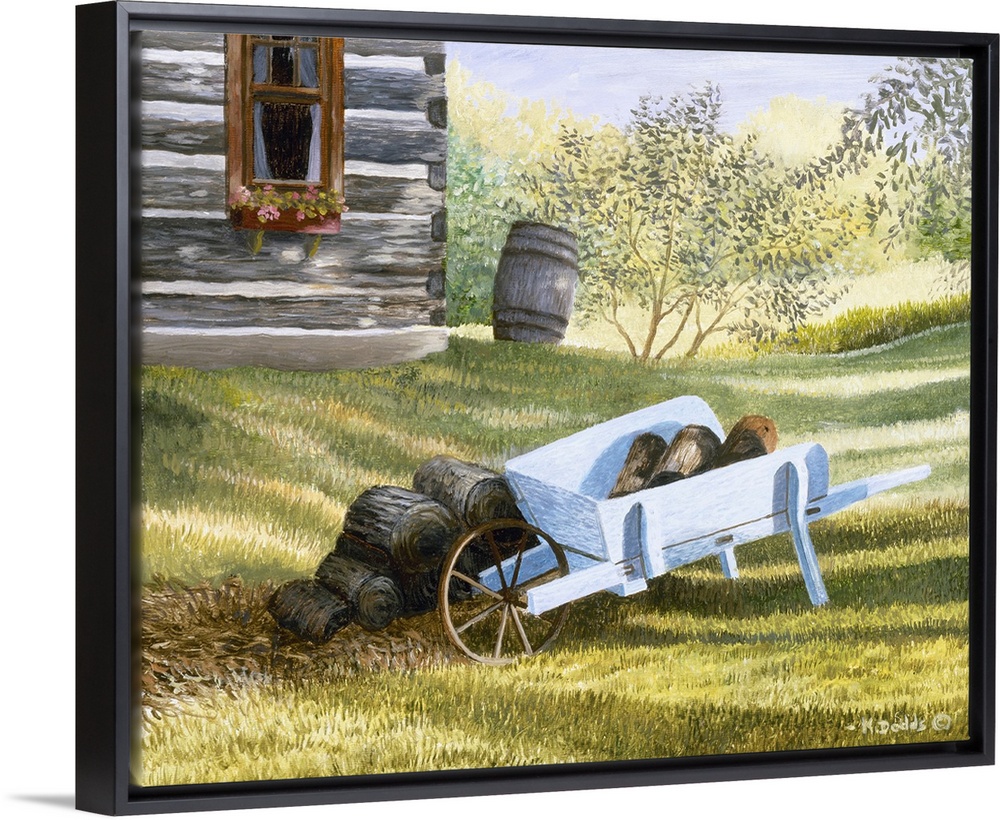 <p>Contemporary artwork of a wheelbarrow full of logs next to a farmhouse.</p>