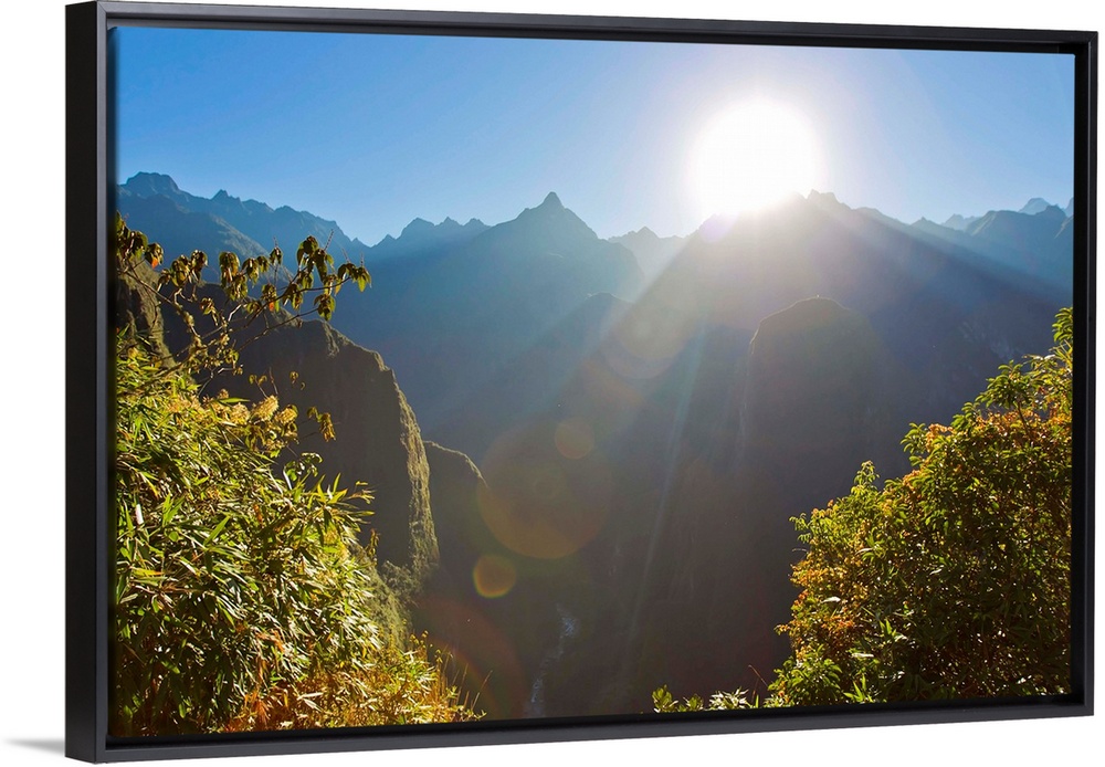 <p>Rays of sun shine through gaps in the Andes mountains at Machu Picchu.</p>