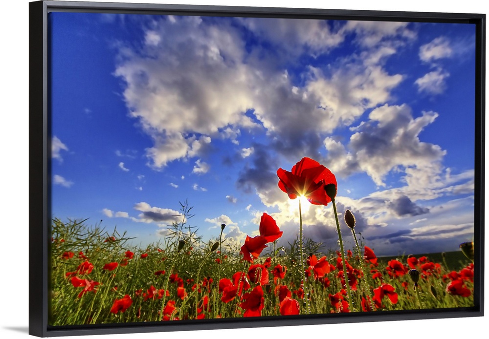 <p>Poppy flowers against cloudy sky with sun.</p>