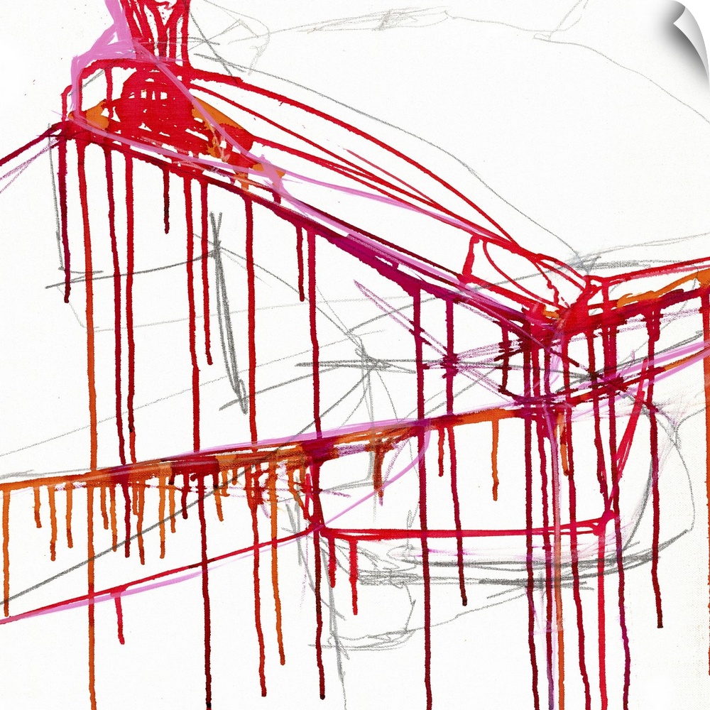 <p>Contemporary abstract artwork with streaks of dripping red paint over white.</p>