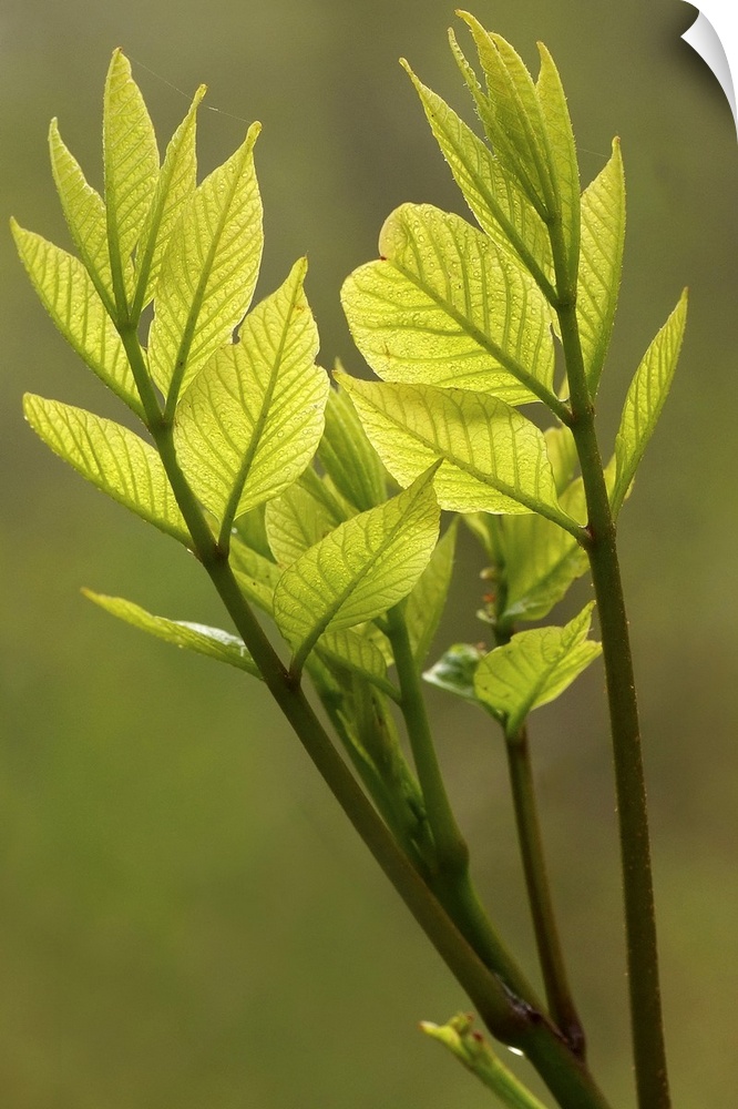 <p>Oversized, vertical, close up photograph of small green leaves at the end of a branch, that appear to be reaching upward toward the sunlight, on a soft focus background of green tones.</p>