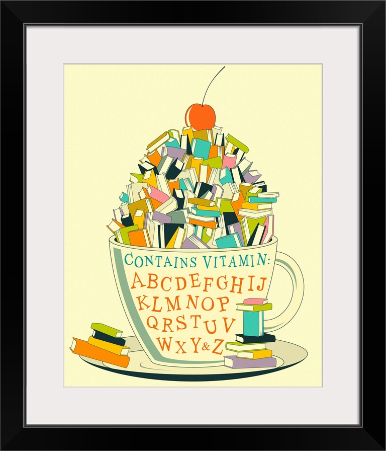 <p>Playful illustration of a teacup and saucer filled with books (and a cherry on top), with "Contains Vitamin: ABCDEFGHIJKLMNOPQRSTUVWXYandZ" written on the cup.</p>