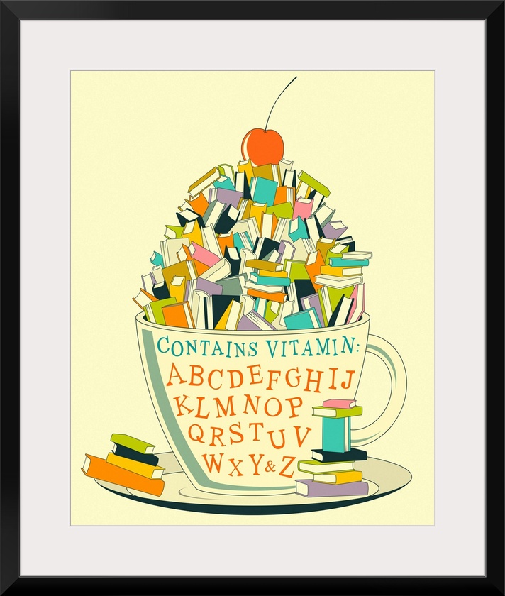 <p>Playful illustration of a teacup and saucer filled with books (and a cherry on top), with "Contains Vitamin: ABCDEFGHIJKLMNOPQRSTUVWXYandZ" written on the cup.</p>