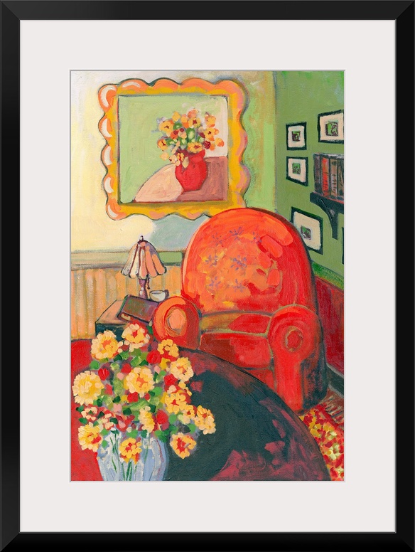 <p>A contemporary painting of a large red arm chair that sits next to a small table with a lamp and book on it. A table of flowers sits in front of the chair as well as a painting of flowers above it.</p>