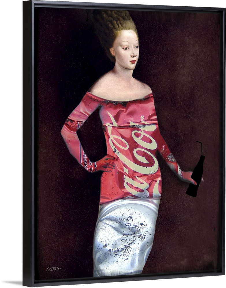 <p>A portrait of a lady holding a glass bottle drink while dressed in a stylish outfit made of a soft drink can.</p>