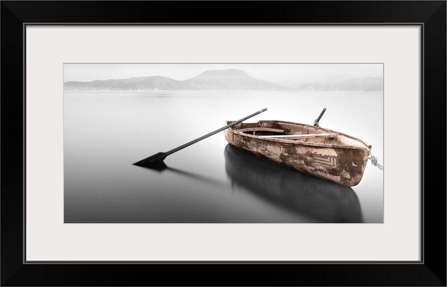 <p>An artistic photograph of a rowboat with no passenger sitting on flat water with a mountainous landscape seen in the foggy distance.</p>