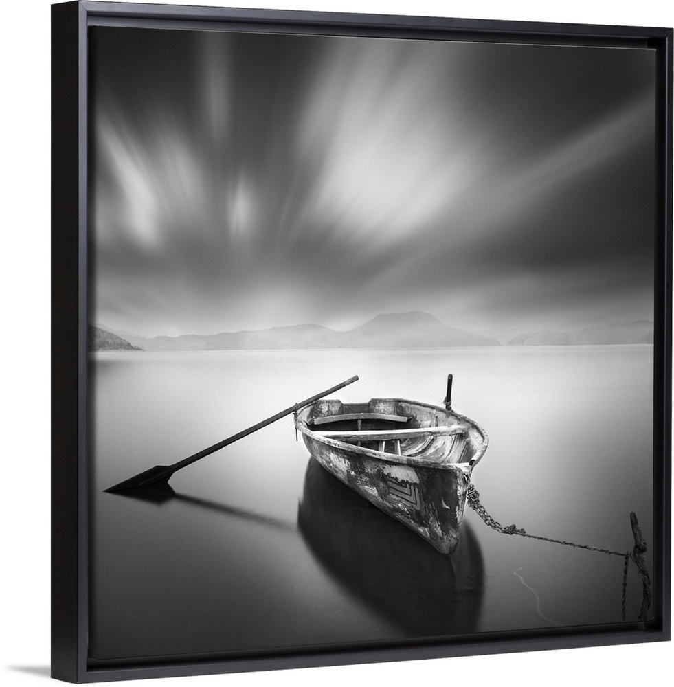<p>An artistic black and white photograph of a lone and unattended rowboat on a still watery surface under a motion blurred sky.</p>