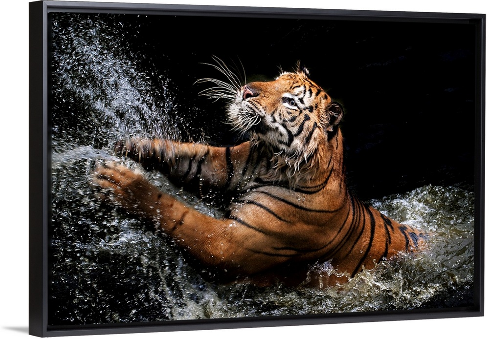 <p>A photograph of a tiger leaping up into the air from shallow water.</p>