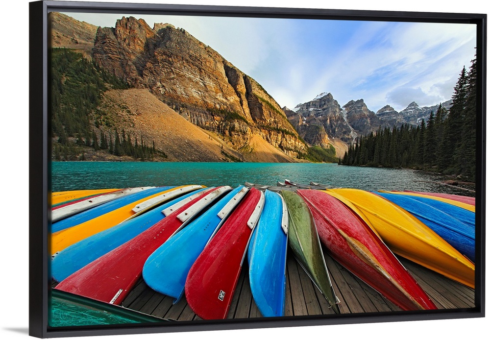<p>Large, horizontal photograph of colorful boats lined up on a dock at Moraine Lake. The mountains in Banff National Park, in Alberta, Canada in the background.</p>