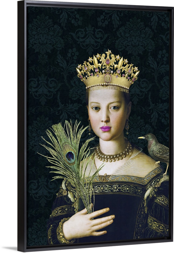 <p>Collage with historical portrait of a woman, bird, peacock feather and golden crown with inscription "real queens fix each other's crown".</p>