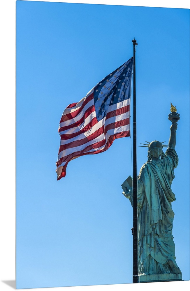 <p>Rear side of Statue of Liberty with US flag, Liberty Island, New York, USA</p>