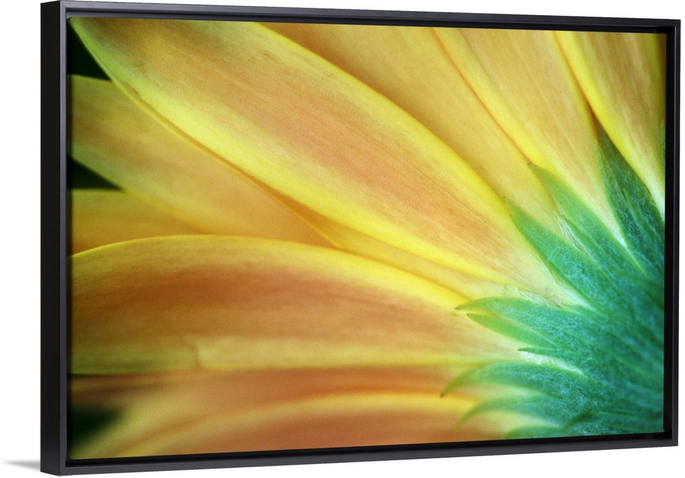 <p>Giant, vertical, close up photograph of the petals of an orange and golden Gerber daisy from behind.</p>