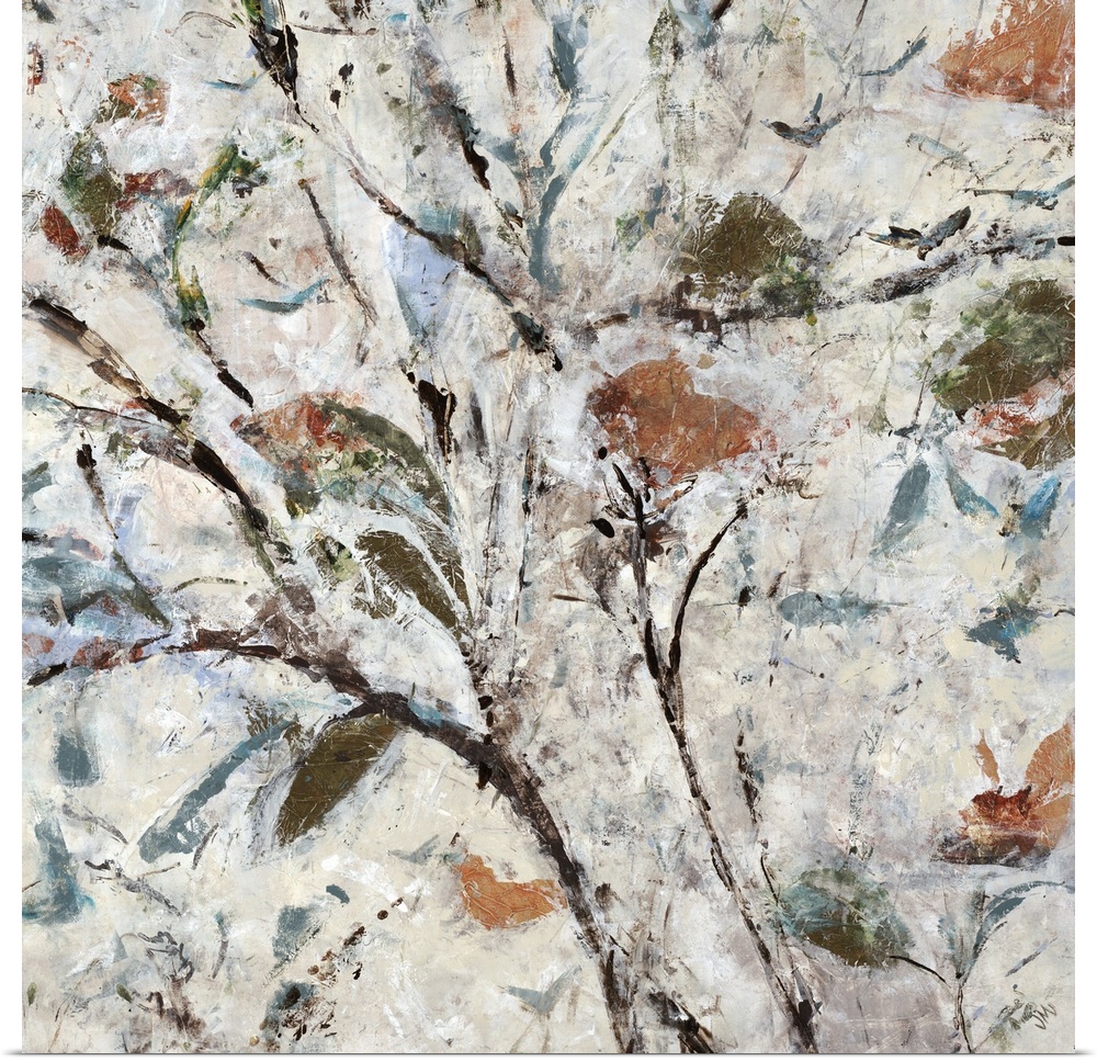 <p>Square abstract painting of a tree with thin, brown branches and green, orange, and blue fall leaves with a heavily textured white background.</p>