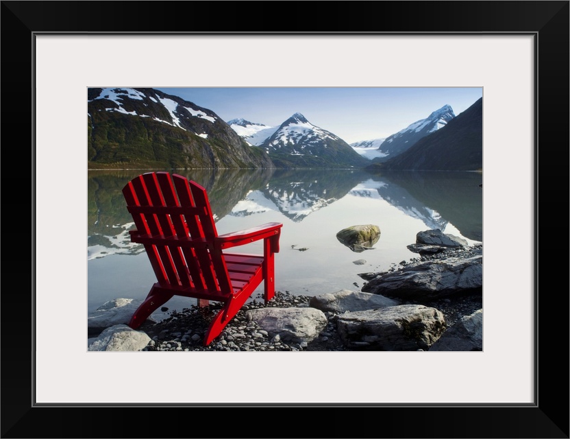 <p>Red Adirondack Chair At Portage Lake With Chugach Mountains In The Background, Southcentral, Alaska</p>