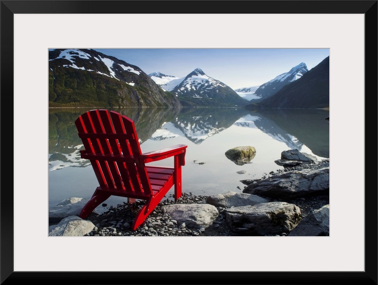 <p>Red Adirondack Chair At Portage Lake With Chugach Mountains In The Background, Southcentral, Alaska</p>