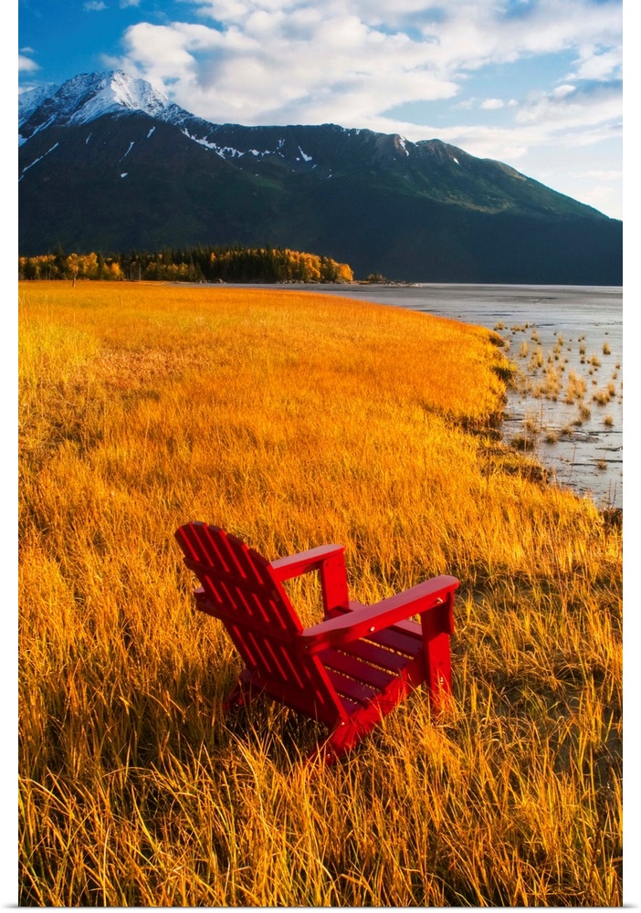 <p>Vertical, large photograph of a single adirondack chair sitting at the edge of a grassy coastline, looking toward the water. A large, snow capped mountain looms in the background, in South-central Alaska.</p>