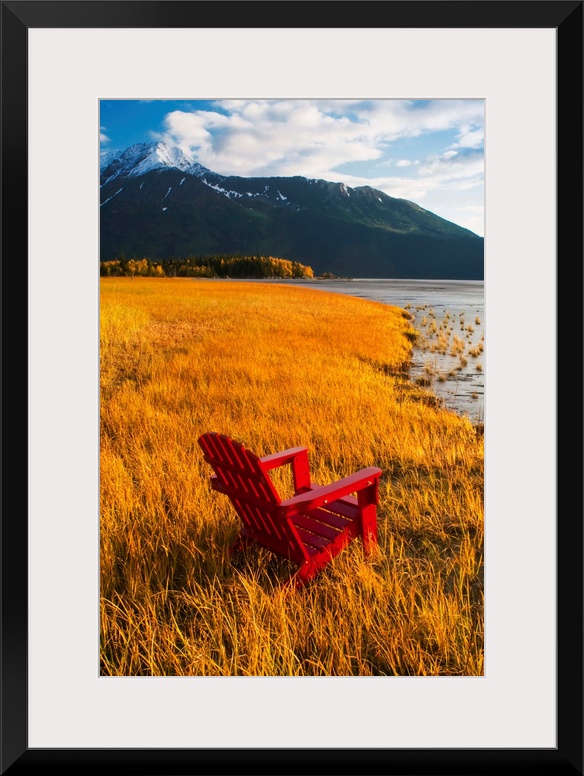 <p>Vertical, large photograph of a single adirondack chair sitting at the edge of a grassy coastline, looking toward the water. A large, snow capped mountain looms in the background, in South-central Alaska.</p>
