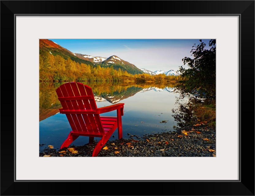 <p>Landscape photograph on a big canvas of a red Adirondack chair sitting at the edge of a lake that is surrounded by trees. Snow covered mountains in the background, in the wilds of Alaska.</p>