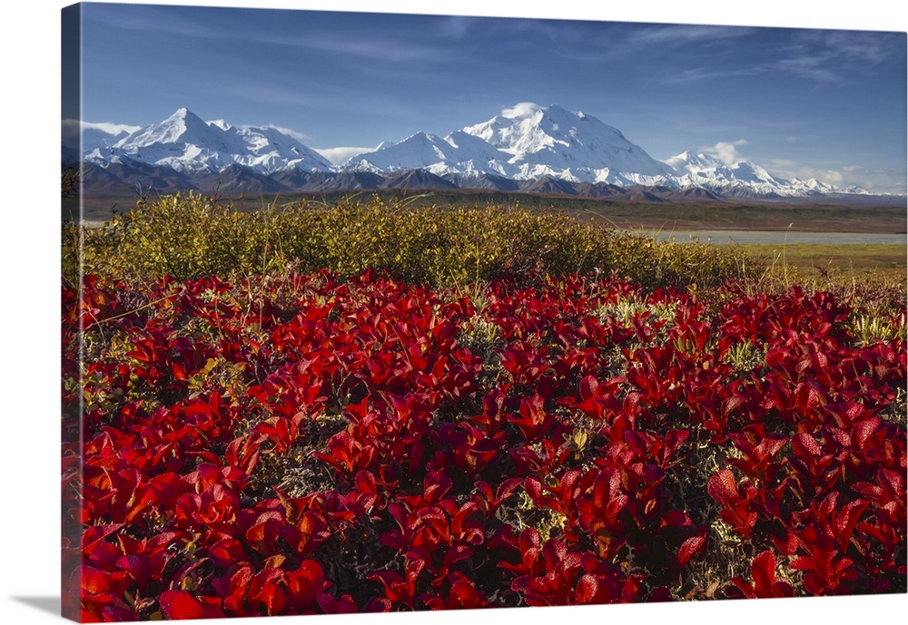 <p>Red Alpine bearberry (Arctostaphylos alpina) and Denali, (20,310 feet high), aka Mount McKinley, is North America's tallest peak Denali National Park and Preserve, Alaska, United States of America</p>