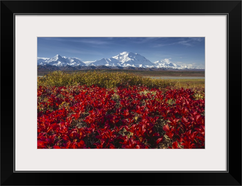 <p>Red Alpine bearberry (Arctostaphylos alpina) and Denali, (20,310 feet high), aka Mount McKinley, is North America's tallest peak Denali National Park and Preserve, Alaska, United States of America</p>