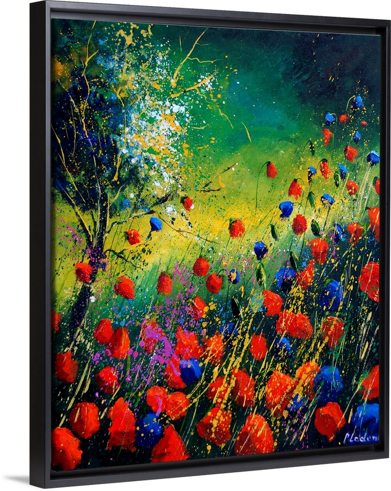 <p>Vertical painting of a field of red and blue poppies along with a single tree with splatters of multi-color paint overlapping the image.</p>