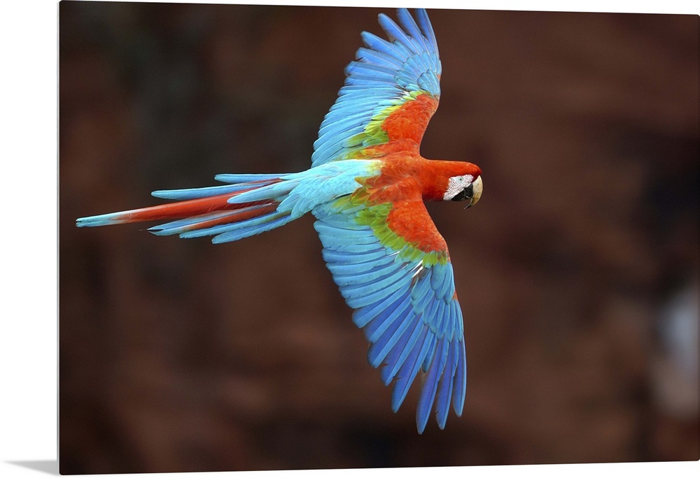<p>Red and Green Macaw (Ara chloroptera) flying, Cerrado habitat, Mato Grosso do Sul, Brazil</p>