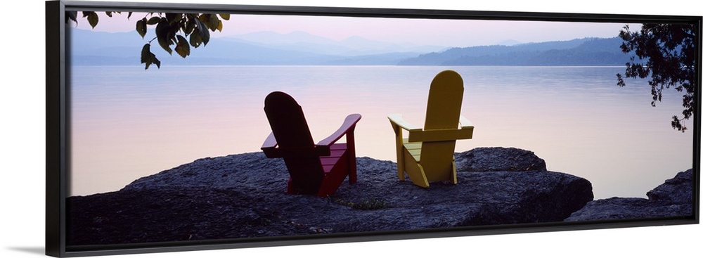 <p>Horizontal photograph on a big canvas of two adirondack chairs sitting at the edge of a rocky cliff, overlooking the calm waters of Champlain Lake in Vermont.</p>