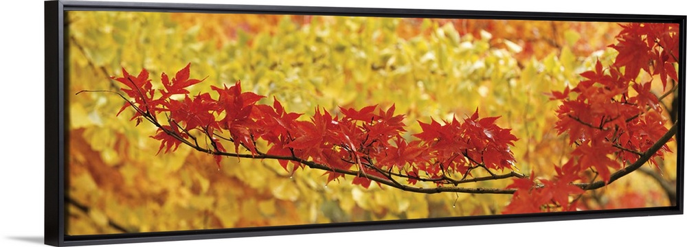 <p>Photograph of a branch lined with dark red maple leaves stretching out over a backdrop of lighter, yellow leaves in the Fall.</p>