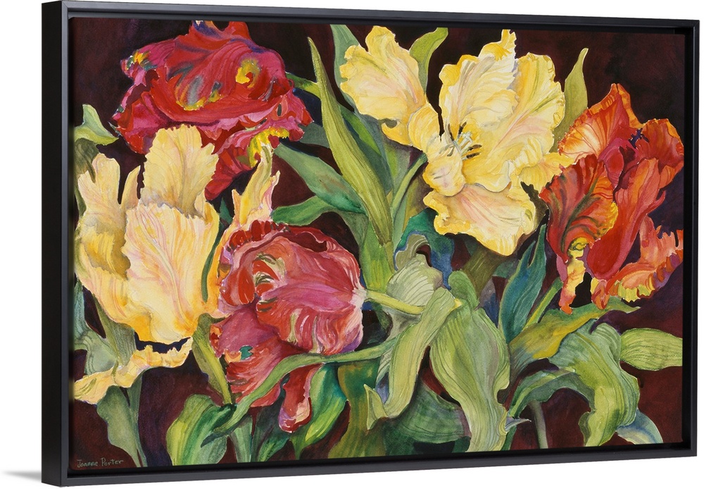 <p>Colorful contemporary painting of red and yellow parrot tulips.</p>