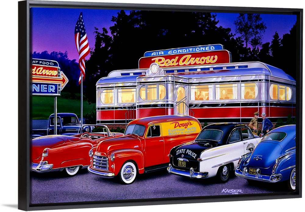<p>Horizontal artwork on a large canvas of an old style trolley car diner in the early 1950s, lit up at night. Parked out front are a 1953 Cadillac, 1949 Ford police car, 1948 Oldsmobile Fastback, 1948 GMC panel truck.</p>