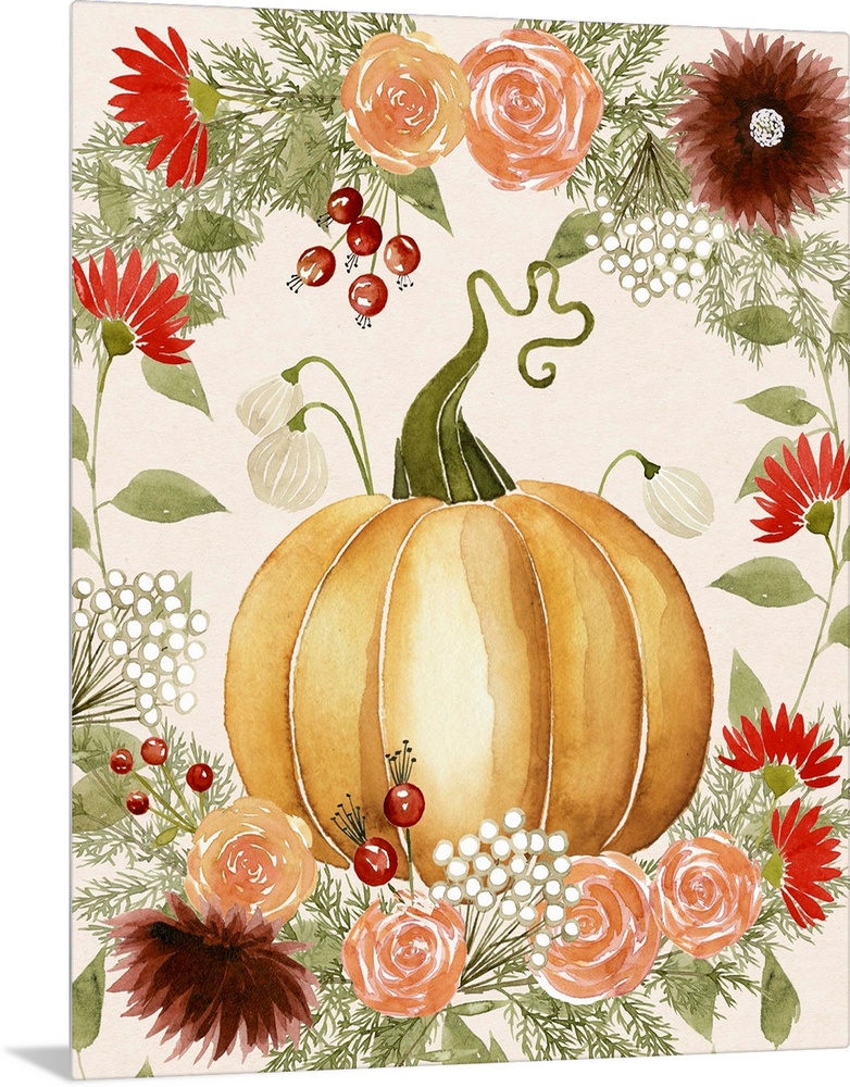 <p>Autumn decor with a watercolor painted pumpkin and Fall florals surrounding it.</p>