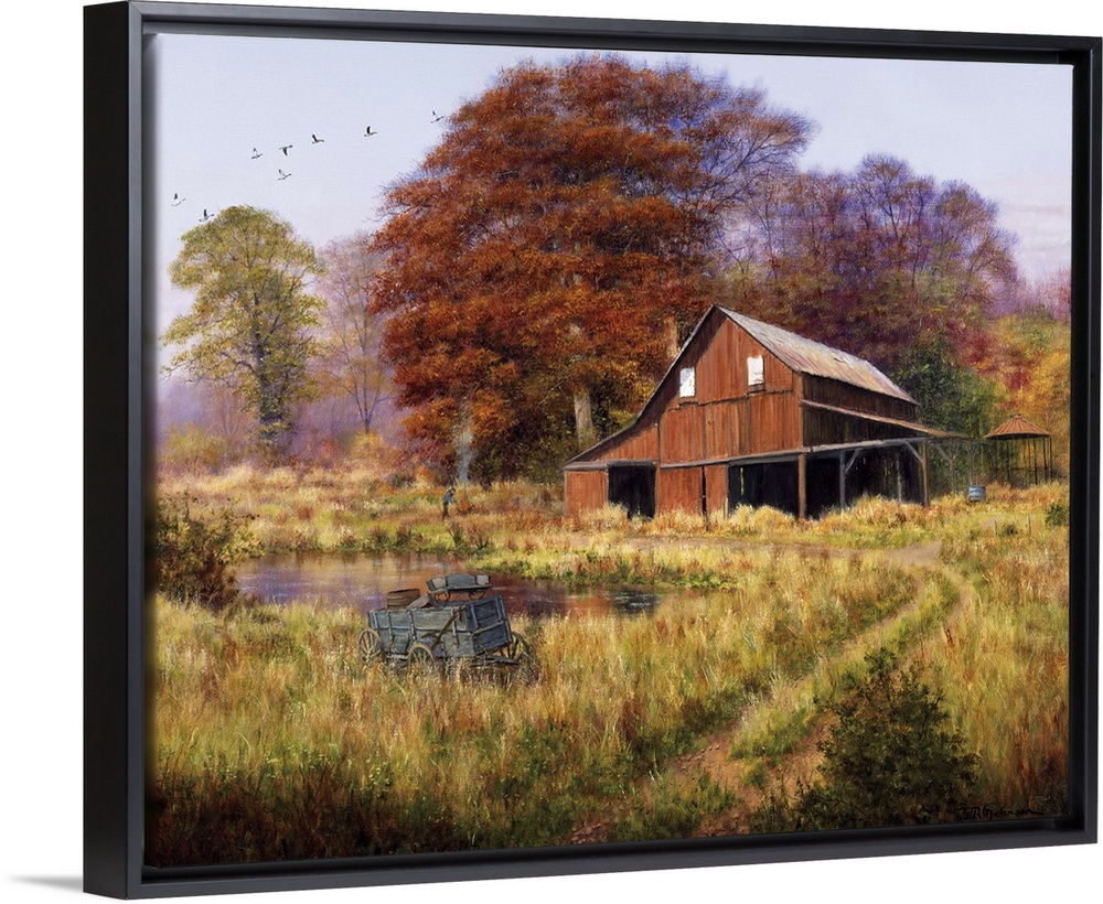 <p>Red barn by pond in field with geese flying south in formation aboveautumn, fall, foliage.</p>