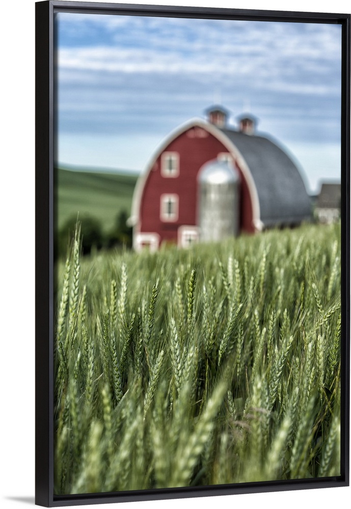 <p>Red barn and green wheat fields in the Palouse, Washington</p>