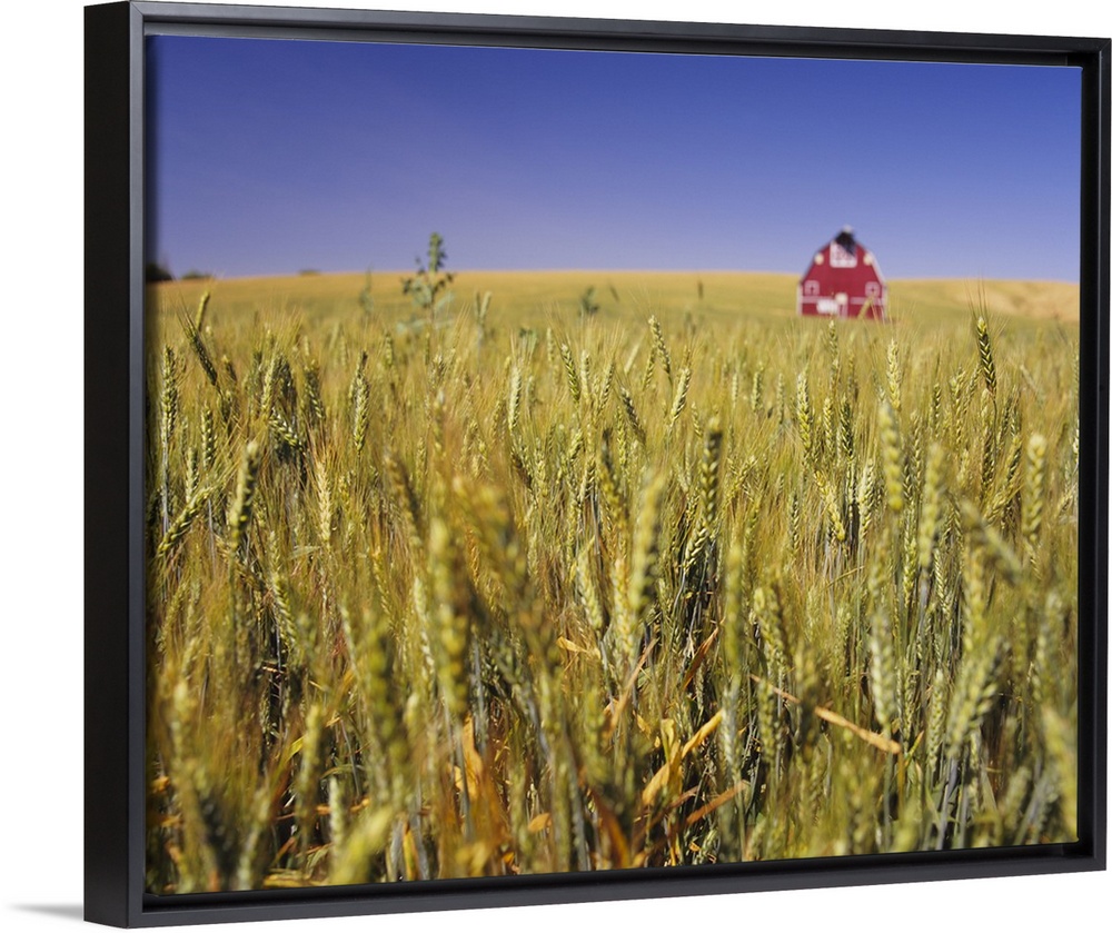 <p>Big image on canvas of a wheat field with a red barn in the middle of it viewed from the top of the wheat.</p>