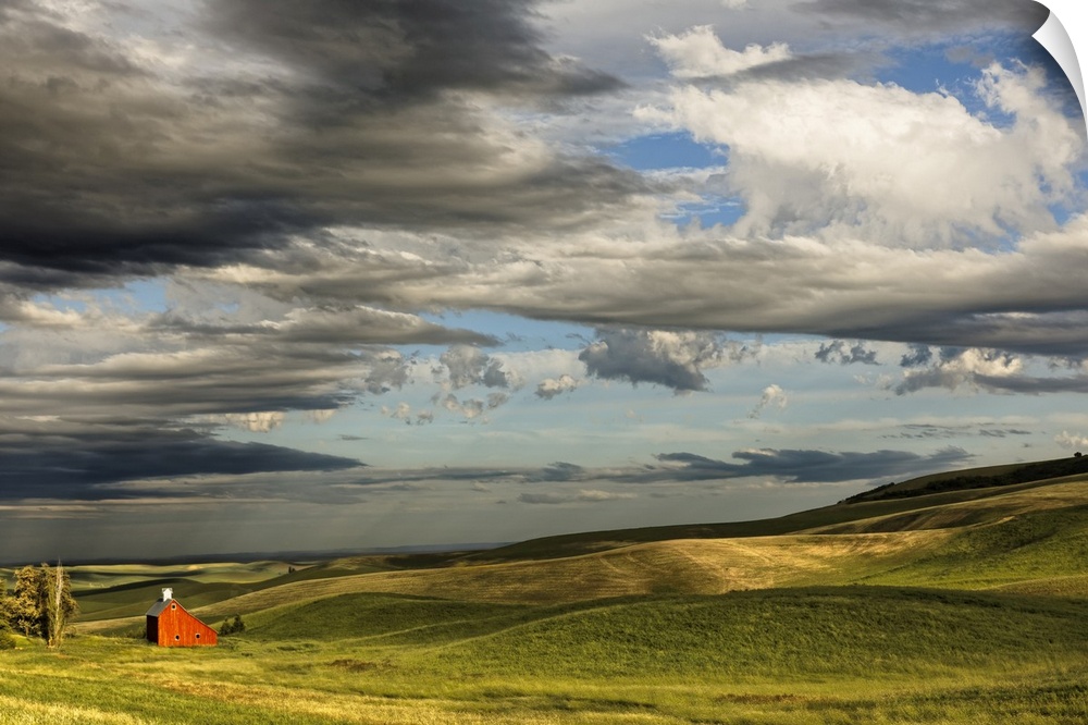 <p>Red barn in valley of rolling farm fields, Palouse agricultural region of western Idaho.</p>