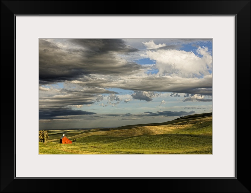 <p>Red barn in valley of rolling farm fields, Palouse agricultural region of western Idaho.</p>