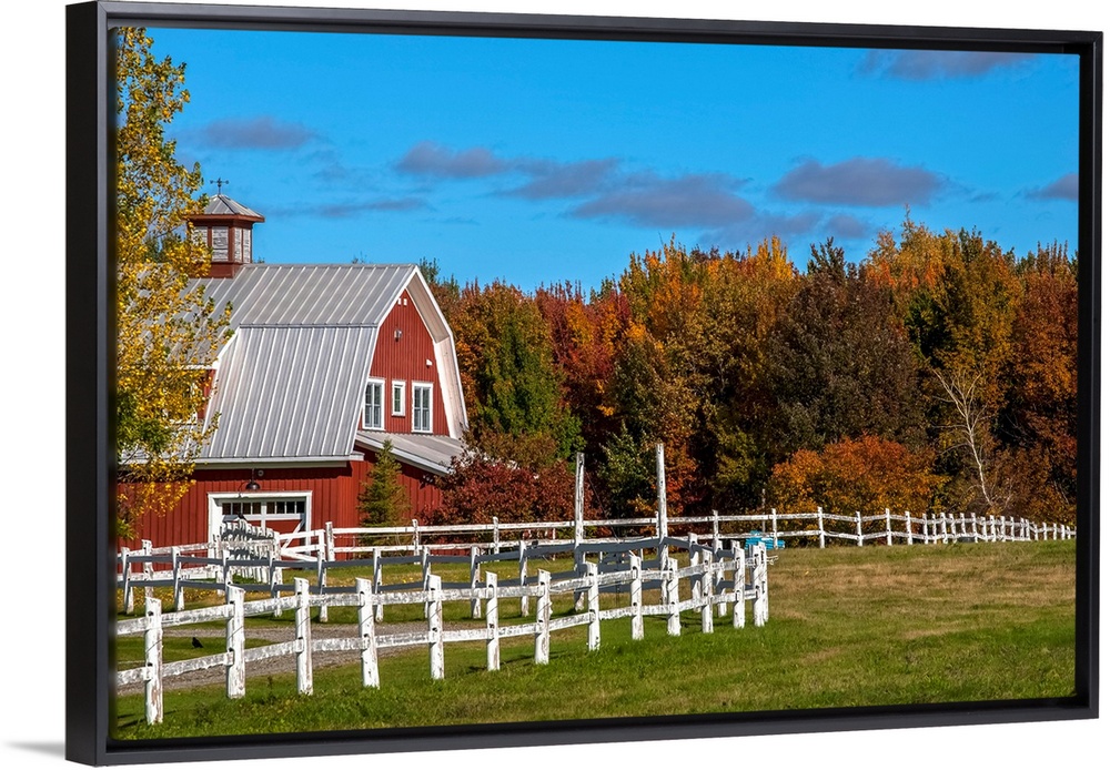 <p>Red barn with trees in autumn colours, Sutton, Quebec, Canada.</p>