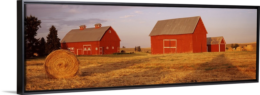 <p>Two red barns sit in a large open field. A single hay bale sits in the foreground of the picture.</p>
