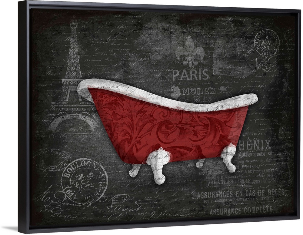 <p>Red cast iron claw foot bathtub against a postage style background with Eiffel Tower.</p>