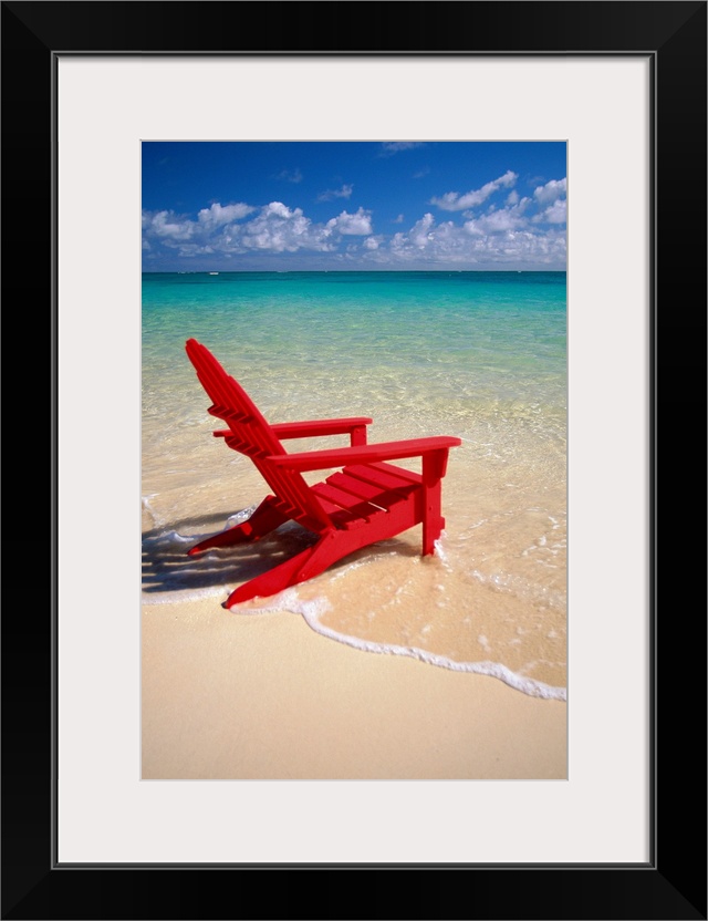 <p>This vertical photograph is taken of a single red beach chair sitting on the edge of the water with a breathtaking view out to the sea.</p>