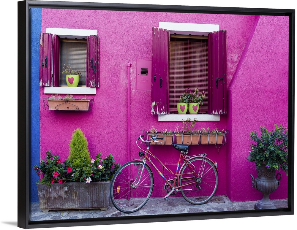<p>Photograph of a red bicycle leaning up against a bright pink and blue wall with cute windows and decorative plants and flowers.</p>