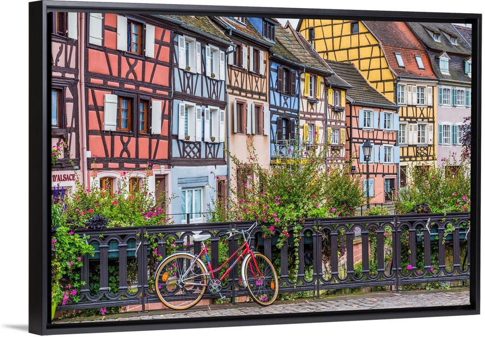 <p>Red Bike And Timbered Buildings, Colmer, Alsace, France</p>
