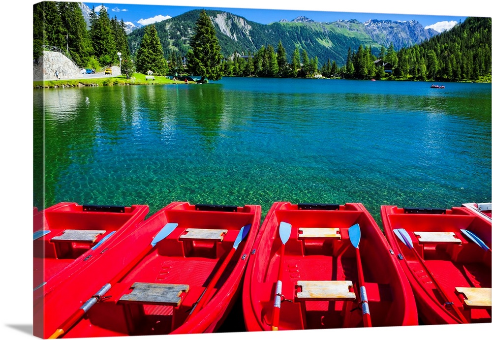 <p>Red boats lined up at Champex Lake under blue sky with a mountain range in the background; Champex, Valais, Switzerland</p>