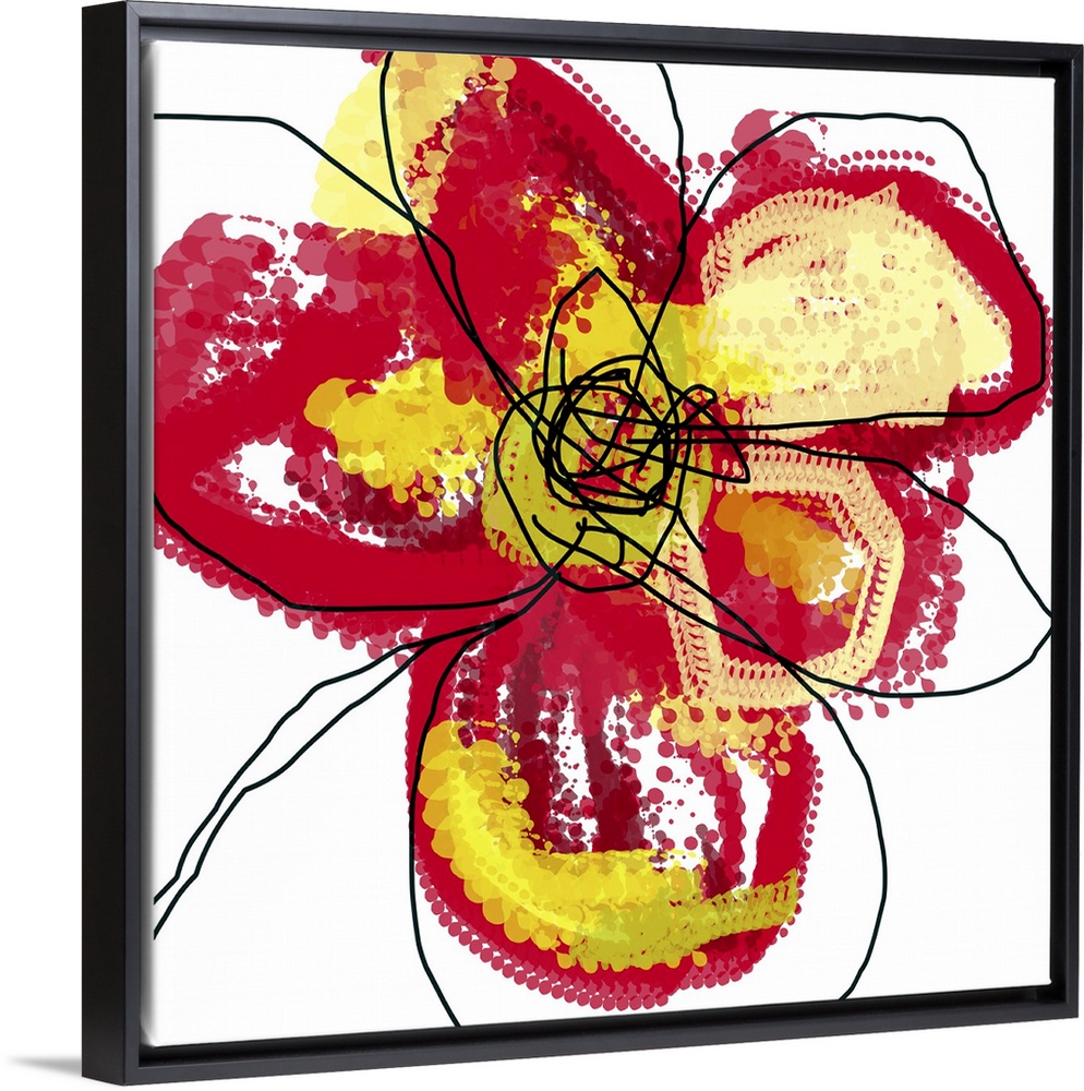 <p>Contemporary pop art. A flower made of repeating circles and smudges is overlain with a shifted black outline, with areas of color bleeding outside of the lines.</p>